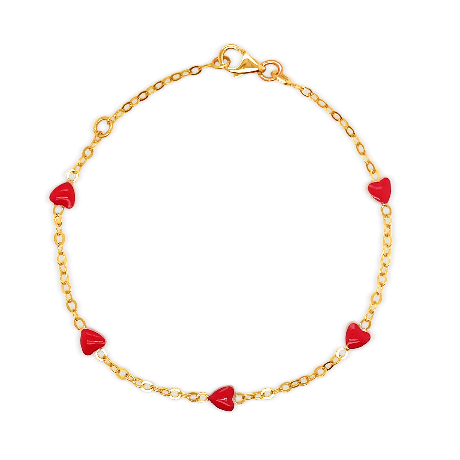 This charming 14k yellow gold red enamel heart bracelet is a classic and meaningful piece for little ones. Designed with vibrant red enamel heart charms, it offers a bold yet timeless look that pairs beautifully with fine gold jewelry.